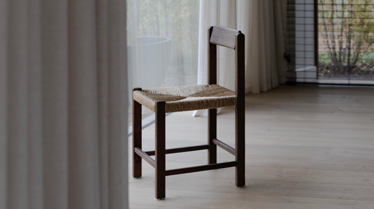 alt="Contemporary kitchen with Mowelli Dianne bar stools in walnut wood and handcrafted upholstery"